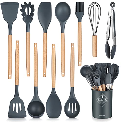 ?15 Premium keukengerei set?Complete kookset - Deze 15-delige keukengerei-set voldoet aan al uw kookbehoeften. Elk van hen heeft zijn eigen unieke gebruik, waaronder skimmer, spatel, spaghettilepel, sleufspatel, sleuflepel, soeplepel, voedseltang, vaste spatel, massieve lepel, garde eieren, spreidspatel, kleine spatel, crèmespatel, olieborstel en opbergdoos ?Voedselkwaliteit siliconen materiaal? Het siliconen keukengerei is gemaakt van voedselveilige siliconen met hoogwaardige roestvrijstalen handgreep, FDA-goedgekeurd, BPA-vrij, niet-giftig, anti-stick, smaakloos, gezond, milieuvriendelijk, zeer veilig te gebruiken in elke soort voedsel. En het zal waarschijnlijk langer meegaan dan ander plastic kookgerei. Wij beloven dat ons kookgerei 100% veilig is voor u en uw gezin ?Hoge hittebestendig? De hittebestendige siliconen spatelset is bestand tegen het veeleisende gebruik van koken, bakken en mengen. Siliconen kookgerei is bestand tegen temperaturen tot 500 graden Fahrenheit/230 °C, je hoeft je geen zorgen te maken dat ze smelten als je ze per ongeluk een tijdje in de pot laat staan. En het behoudt geen geuren of kleuren wanneer het wordt gebruikt om diep gekleurde voedingsmiddelen zoals voedselproducten op basis van tomaten te roeren ?Eenvoudig te reinigen en op te bergen?: deze hoogwaardige siliconen keukengerei-set is gemakkelijk te wassen, gewoon met heet water reinigen of in de vaatwasser gooien. Bovendien beschermt het koken met de anti-aanbaksiliconen kookgerei het oppervlak van alle kachels en pannen tegen krassen. Elk van deze gebruiksvoorwerpen heeft een handig ophanggat voor ophanging. Je kunt alles ook in de opbergdoos stoppen ?Geweldig cadeau voor familie of vrienden?: dit siliconen keukengerei heeft alles wat je nodig hebt om je keuken te starten of je huidige set te vervangen. Je kunt deze gereedschappen gebruiken om curry's, pastasauzen en soepen te maken, enz. Het is zeker een geweldig cadeau voor iedereen die graag kookt